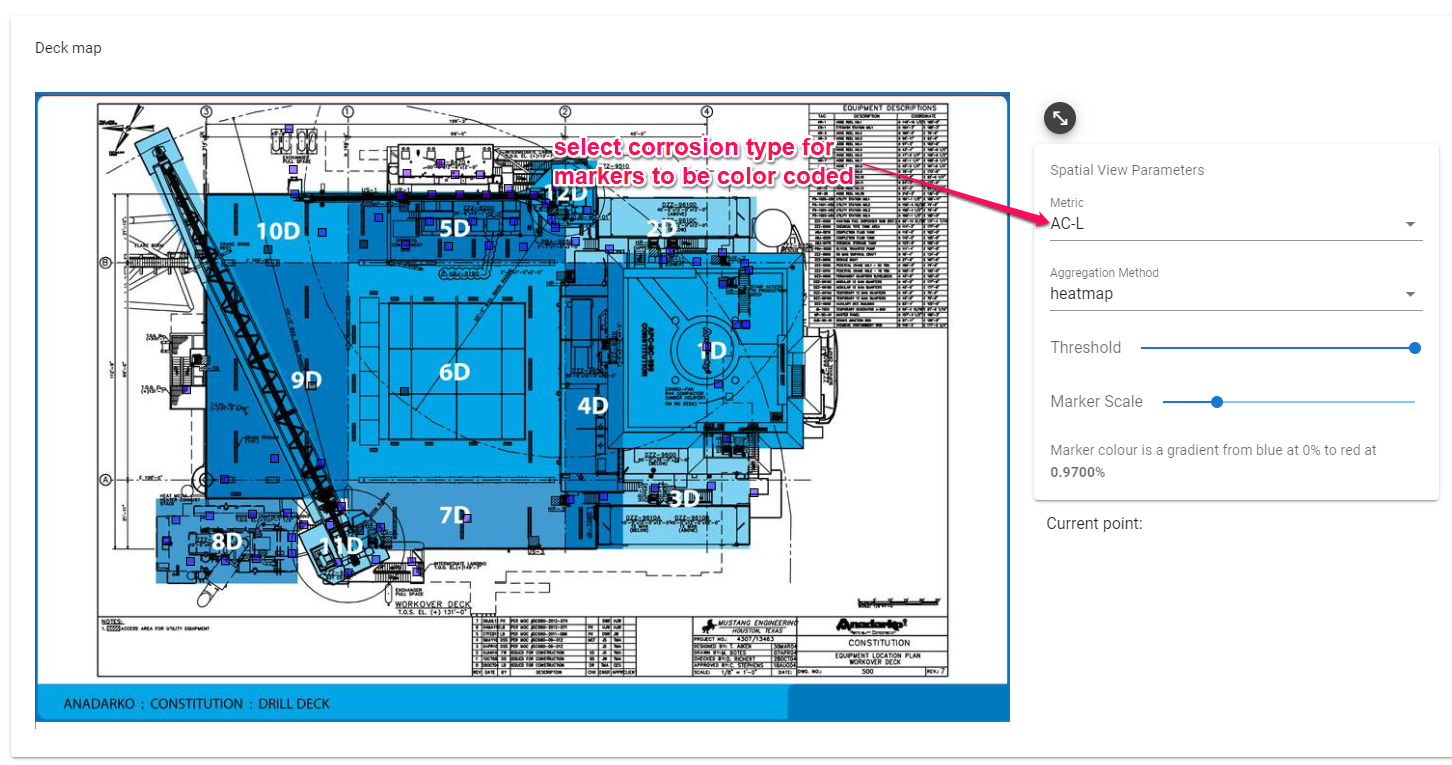 The locations on the deck plan are color coded. By default blue markers indicate there is no corrosion visible from the image, and red meaning fully corroded. The Controls panel allows you to customize the scale used to control the heat map coloring, making it easier to see part corrosion relative to other parts on the deck.