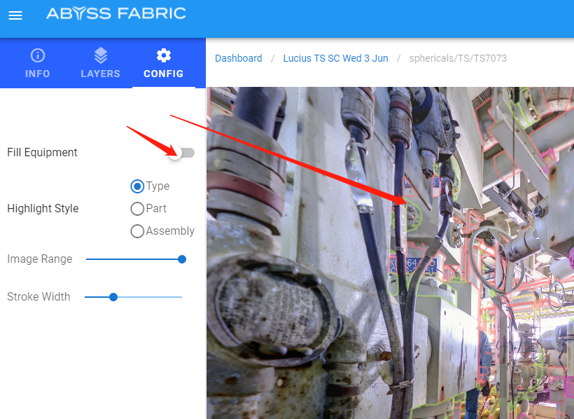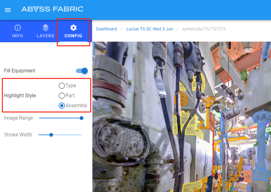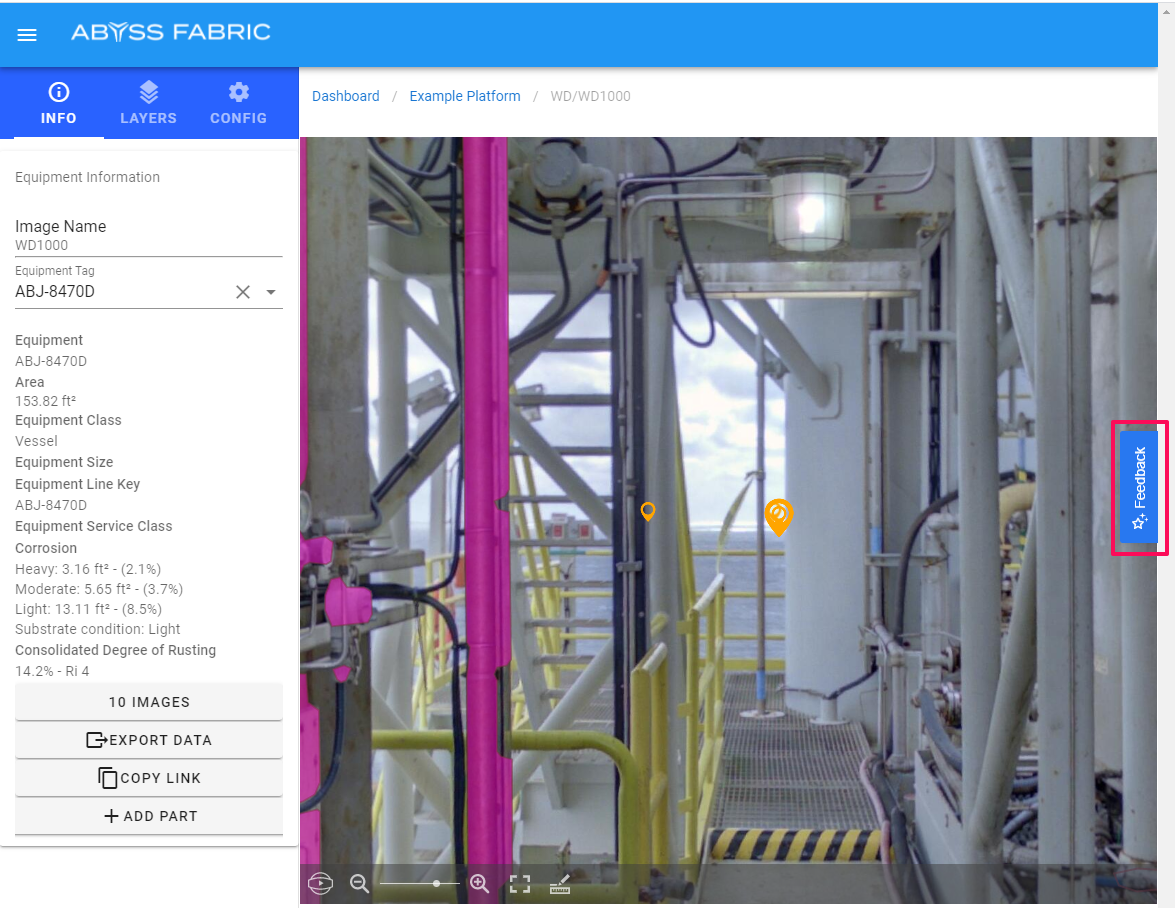 To control the display of corrosion while in the spherical viewer, you can turn the layers on/off through the layers tab. Corrosion is classified as Light, Moderate and Heavy based on the client standard and framework agreed upon with Abyss.