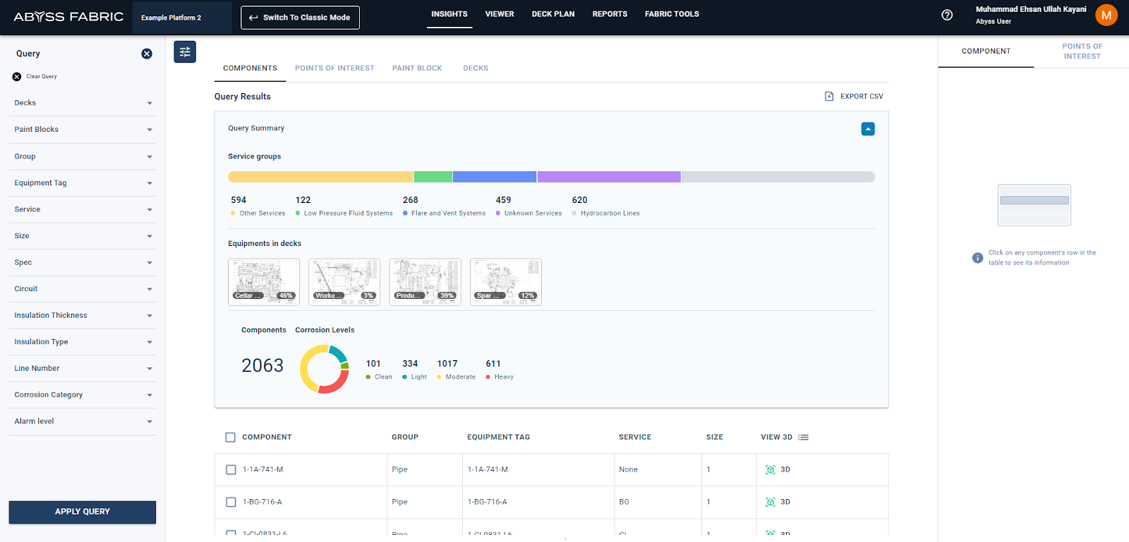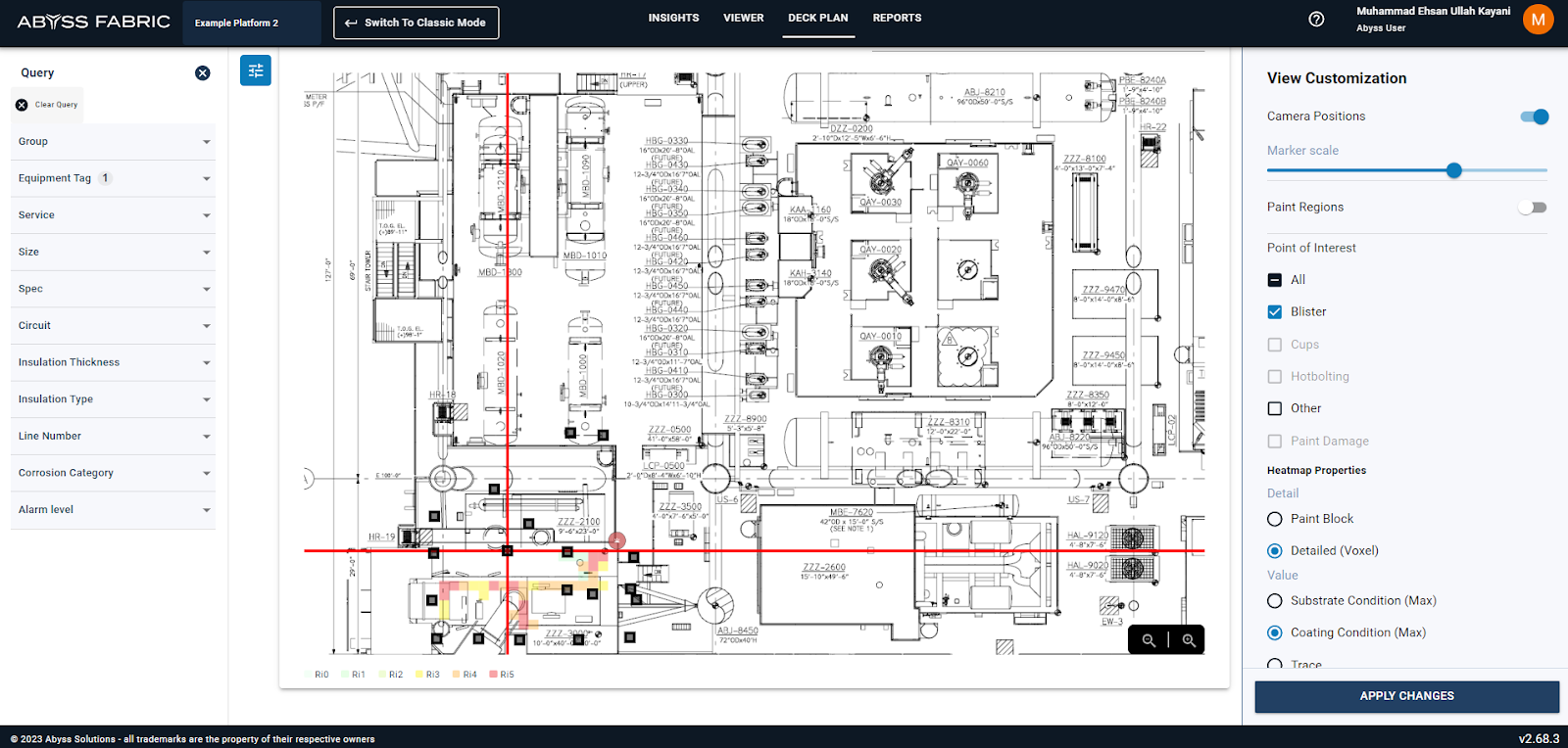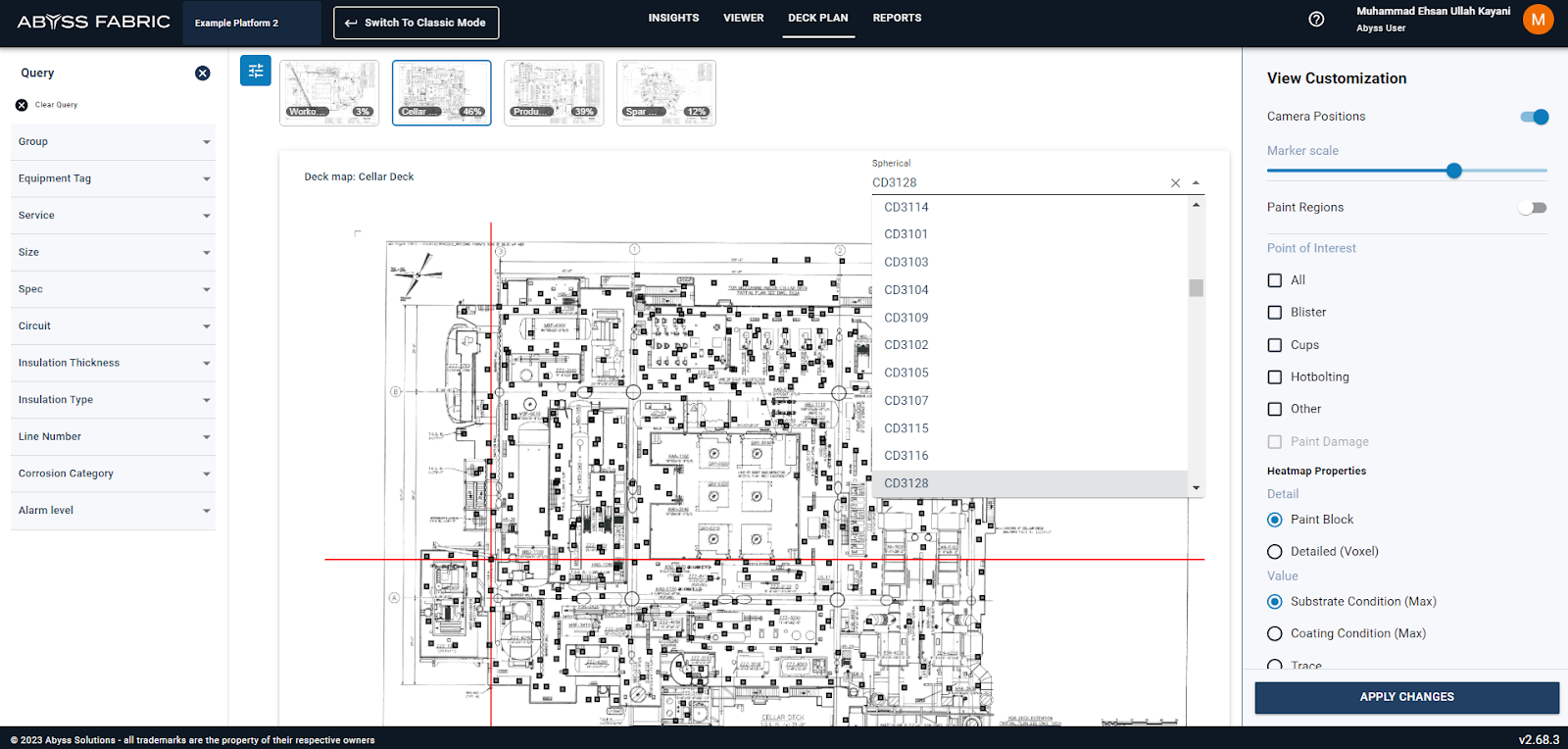If the user is interested in focusing on the desired query (single asset or assets with similar diameter or service) instead of the entire deck, the user can select the apply query function and then apply changes. This will show the POI markers, heatmaps and camera locations relevant only to the query. The thumbnails of decks in which query does not exist will be grayed out and areas per deck will change correspondingly